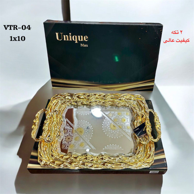 متاسفانه این کالا در حال حاضر موجود نیست. میتوانید از طریق لیست بالای صفحه، از محصولات مشابه این کالا دیدن نمایید.سینی ۲تیکه استیل طلایی مستطیل